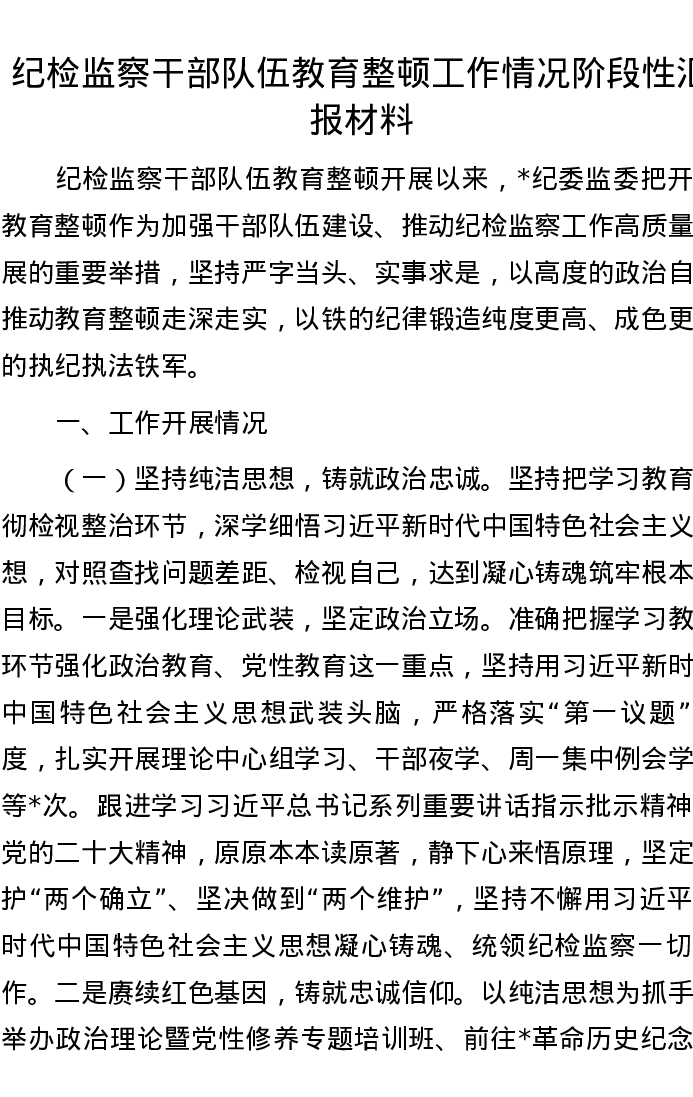 纪检监察干部队伍教育整顿工作情况阶段性汇报材料