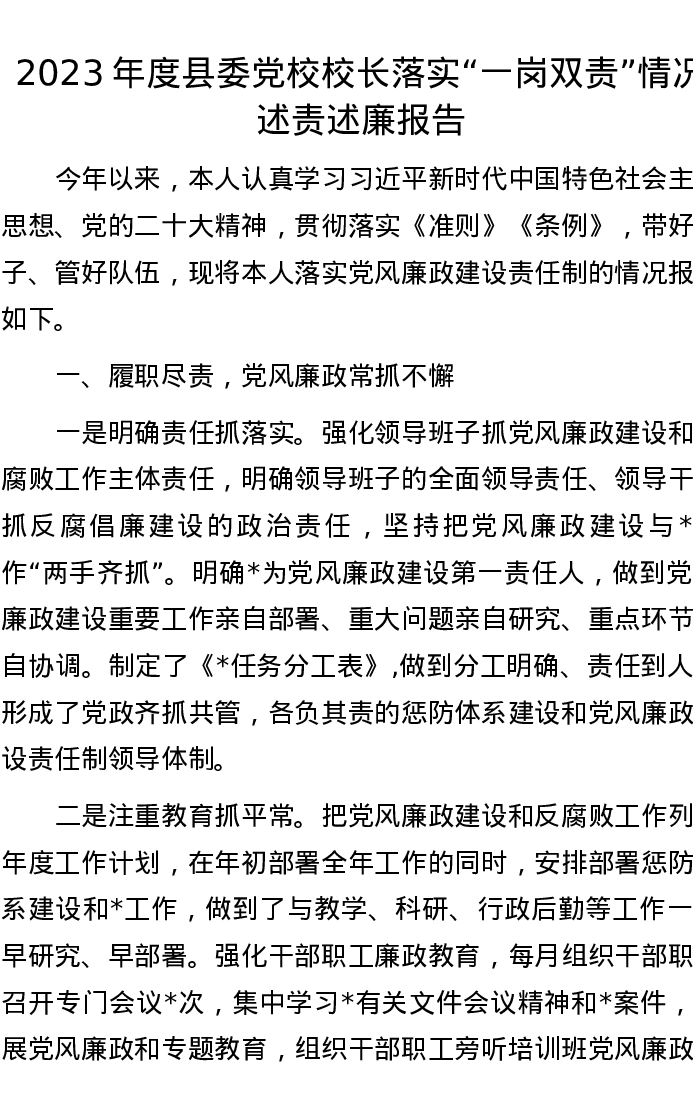 2023年度县委党校校长落实“一岗双责”情况述责述廉报告