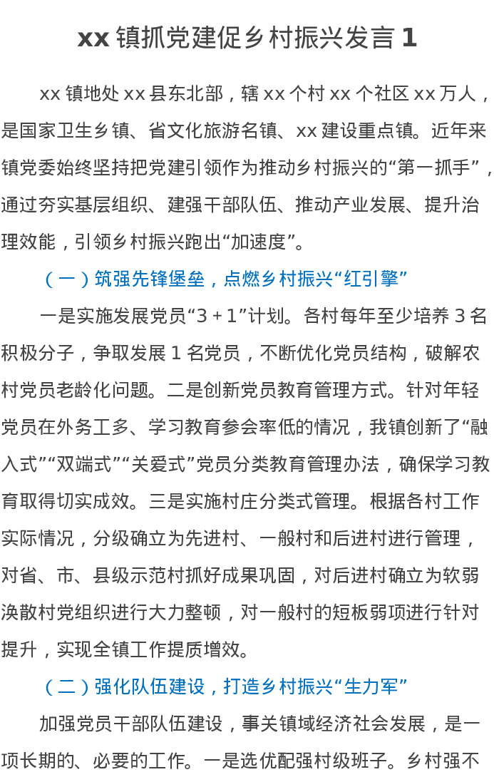 xx镇抓党建促乡村振兴发言1