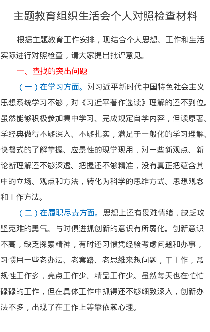 主题教育组织生活会个人对照检查材料(四个方面特色社会主义思想)