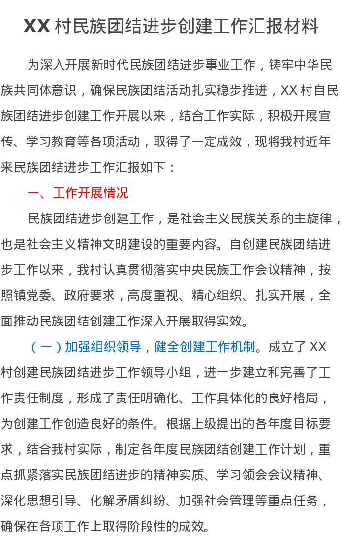 XX村民族团结进步创建工作汇报材料