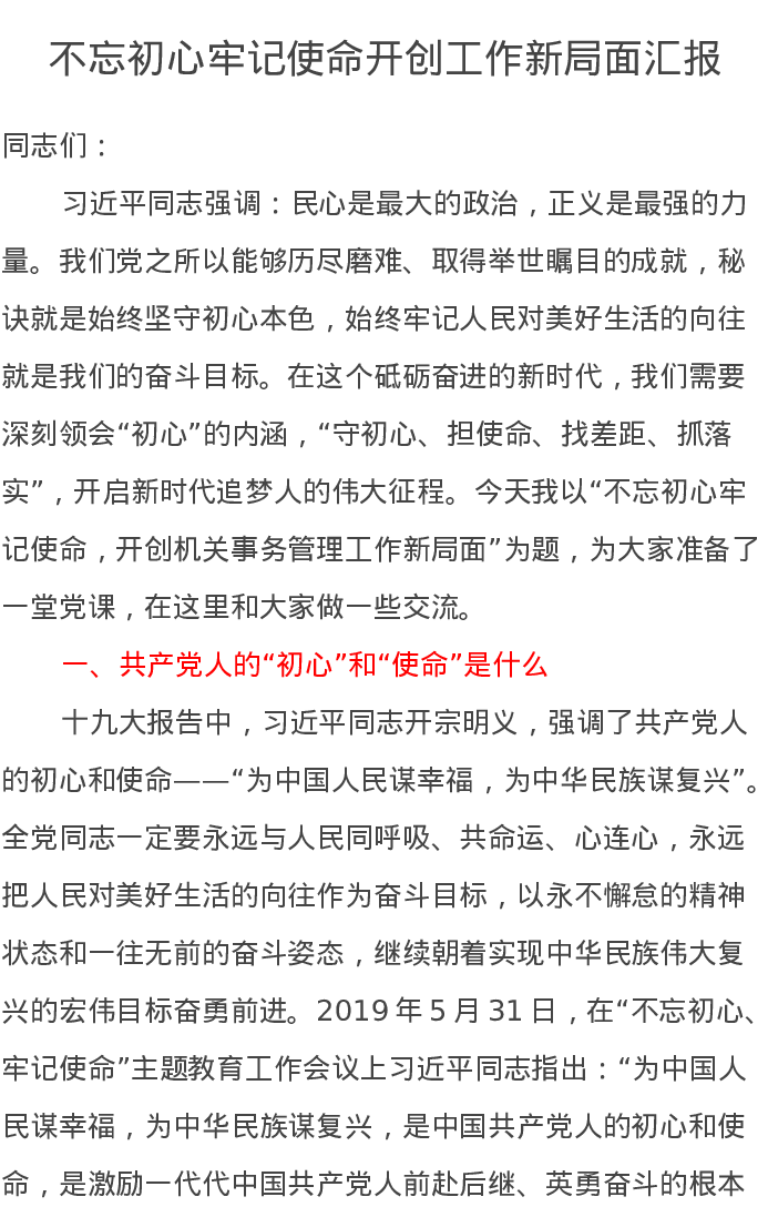 不忘初心牢记使命开创工作新局面汇报