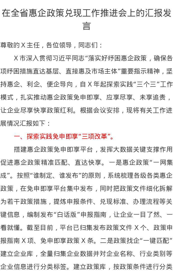 在全省惠企政策兑现工作推进会上的汇报发言