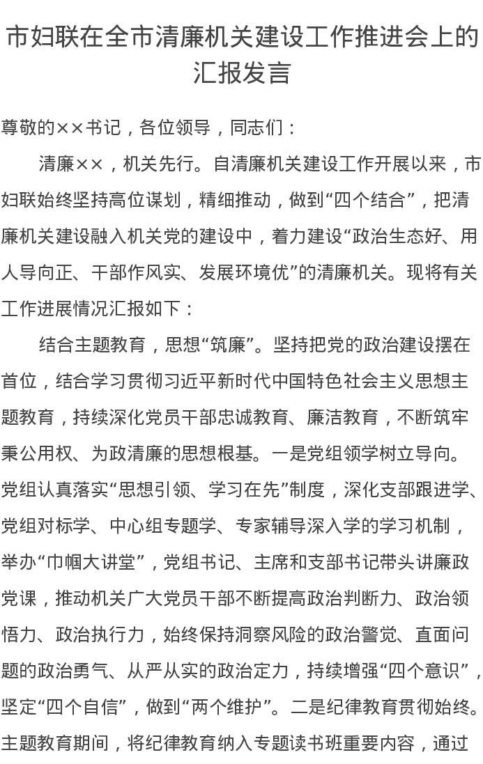 市妇联在全市清廉机关建设工作推进会上的汇报发言