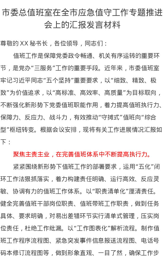 市委总值班室在全市应急值守工作专题推进会上的汇报发言材料