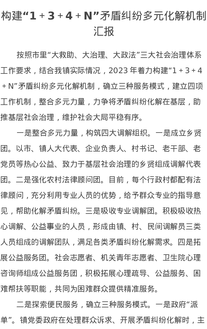 构建“1+3+4+N”矛盾纠纷多元化解机制汇报