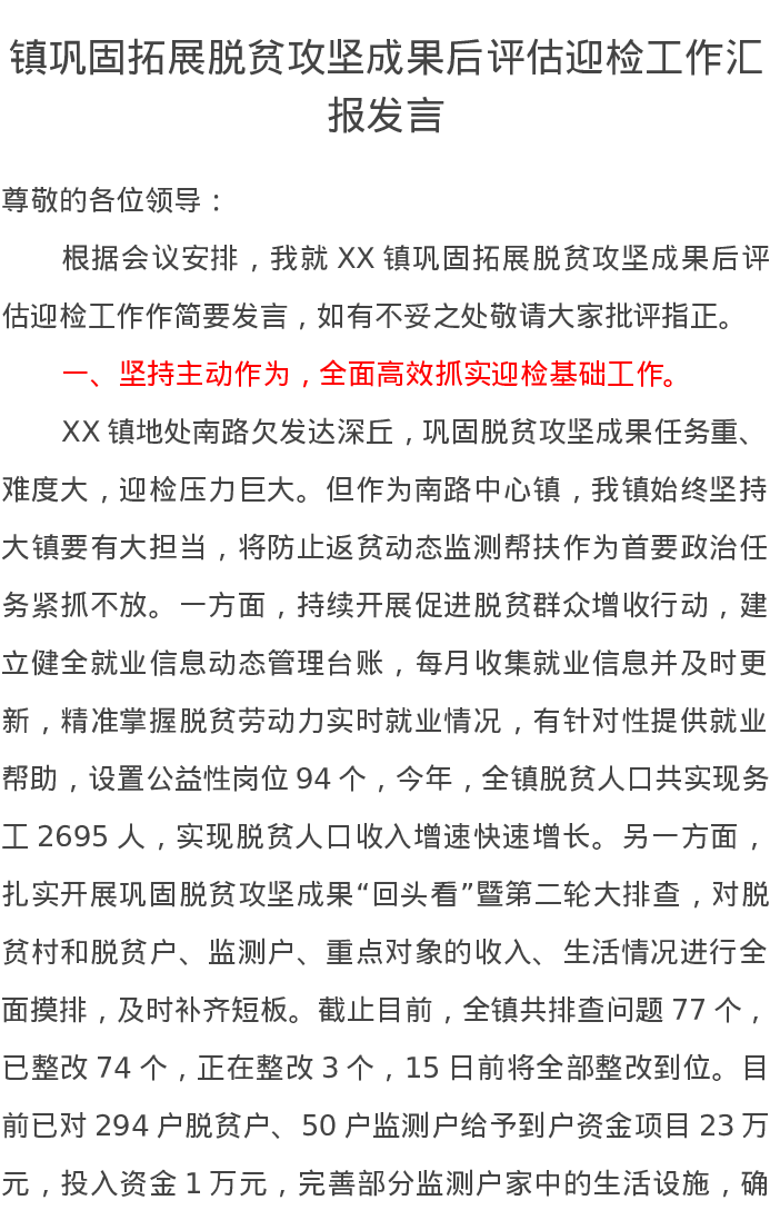 镇巩固拓展脱贫攻坚成果后评估迎检工作汇报发言