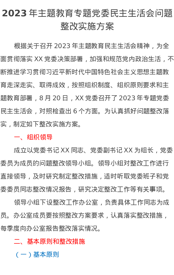 2023年主题教育专题党委民主生活会问题整改实施方案(特色社会主义思想)