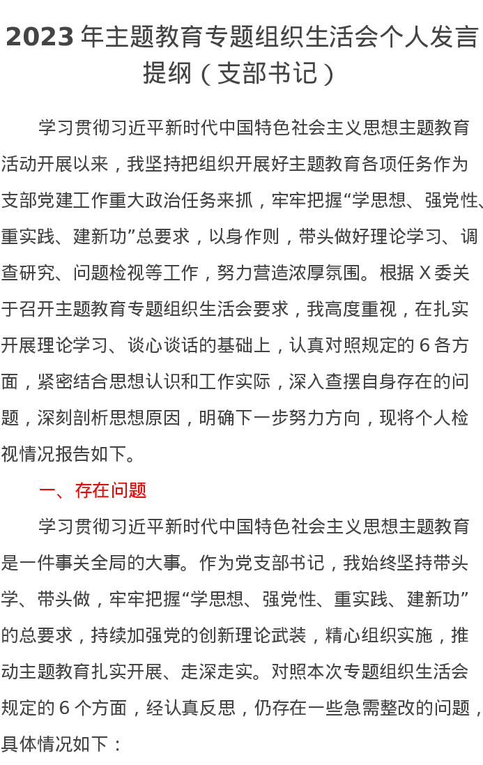 2023年主题教育专题组织生活会个人发言提纲(支部书记)特色社会主义思想