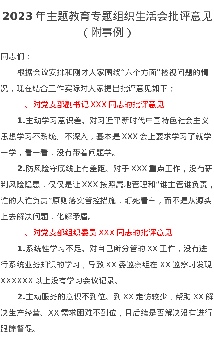 2023年主题教育专题组织生活会批评意见(附事例)特色社会主义思想