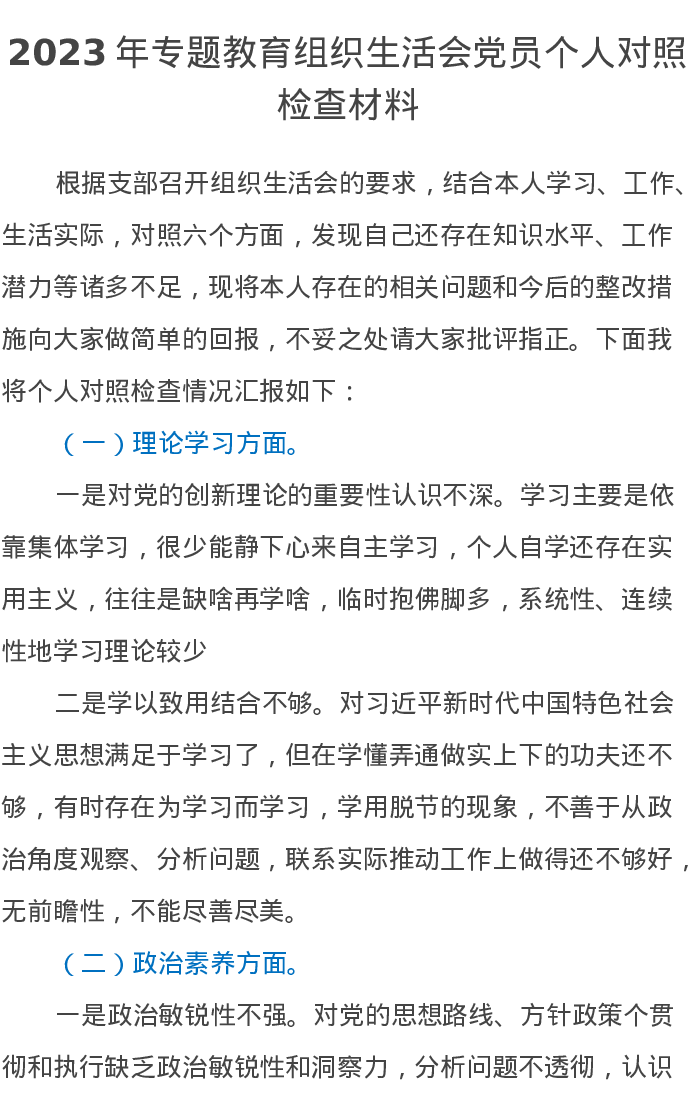 2023年主题教育组织生活会党员个人对照检查材料(六个方面特色社会主义思想)