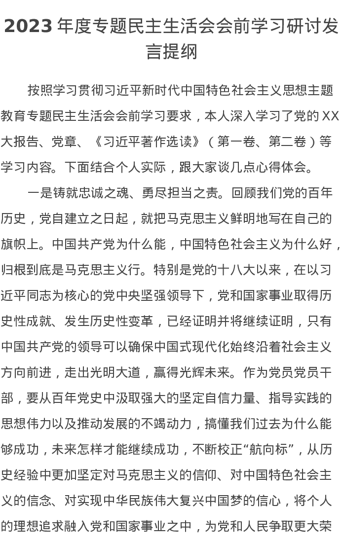 2023年度专题民主生活会会前学习研讨发言提纲2(特色社会主义思想)