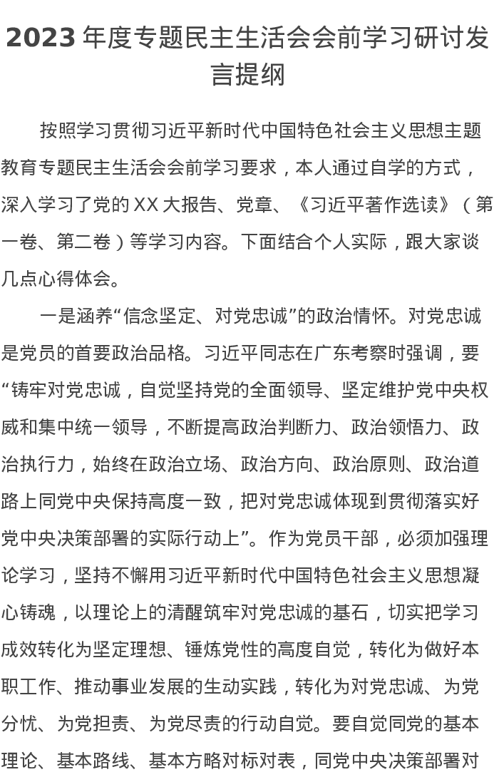 2023年度专题民主生活会会前学习研讨发言提纲(特色社会主义思想)