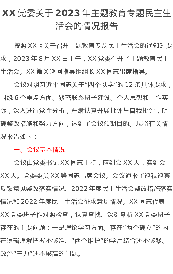 XX党委关于2023年主题教育专题民主生活会的情况报告(特色社会主义思想)
