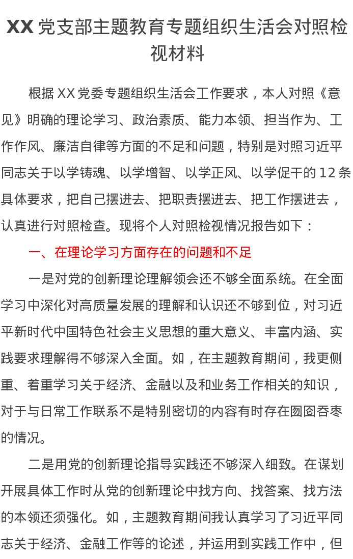 XX党支部主题教育专题组织生活会对照检视材料(六个方面特色社会主义思想)