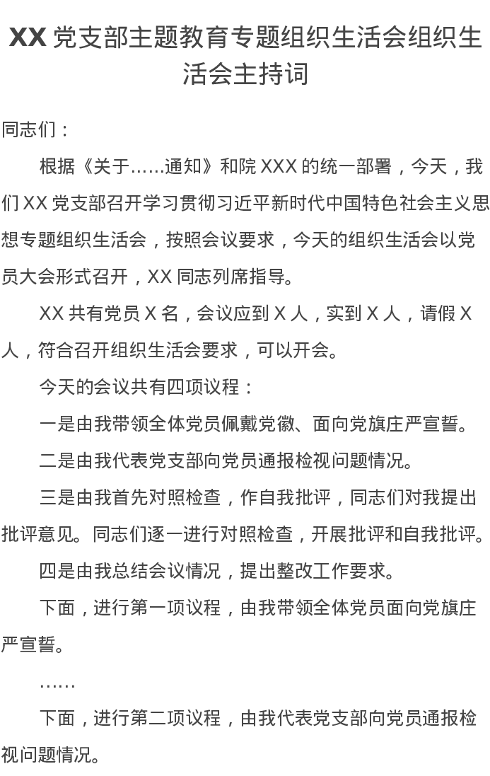 XX党支部主题教育专题组织生活会组织生活会主持词(特色社会主义思想)