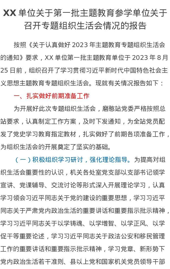 XX单位关于第一批主题教育参学单位关于召开专题组织生活会情况的报告(特色社会主义思想)