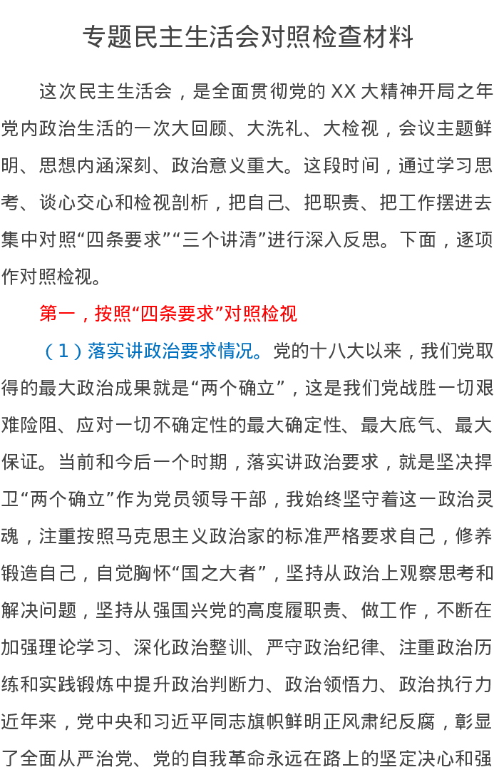专题民主生活会对照检查材料
