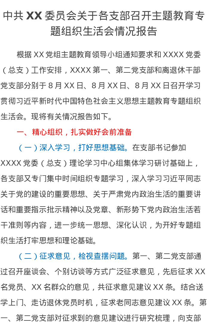 中共XX委员会关于各支部召开主题教育专题组织生活会情况报告(特色社会主义思想)