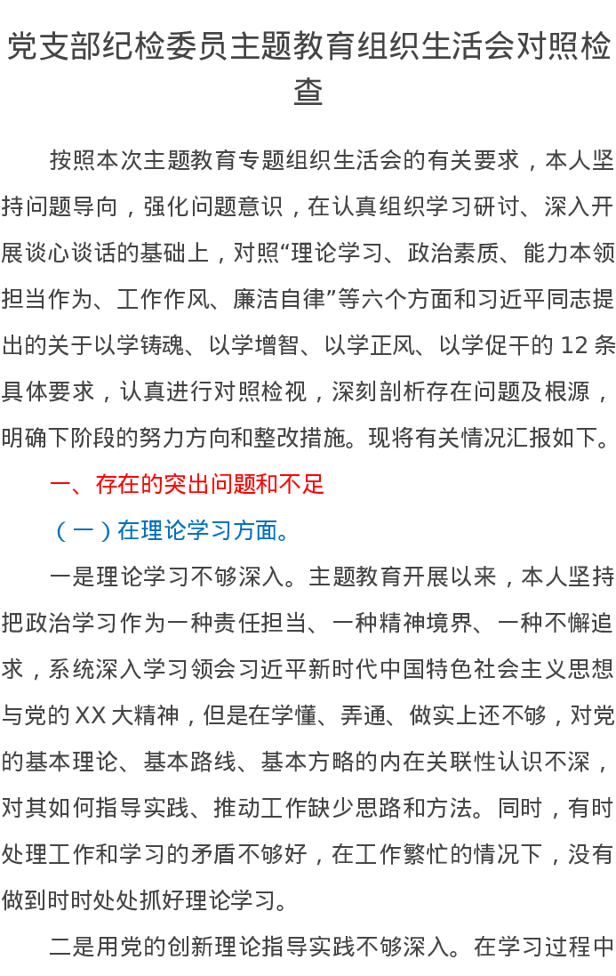 党支部纪检委员主题教育组织生活会对照检查(特色社会主义思想)
