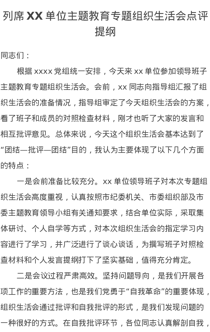 列席XX单位主题教育专题组织生活会点评提纲(特色社会主义思想)