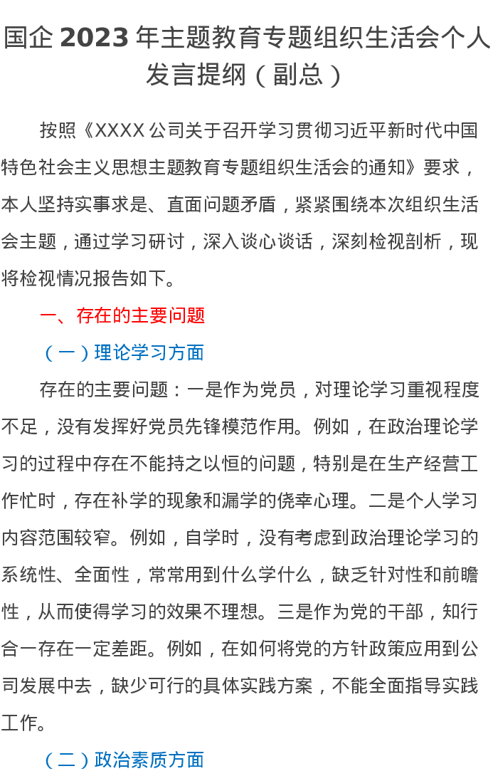 国企2023年主题教育专题组织生活会个人发言提纲(副总)六个方面特色社会主义思想