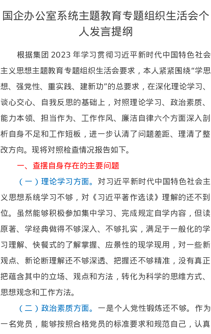 国企办公室系统主题教育专题组织生活会个人发言提纲(六个方面特色社会主义思想)