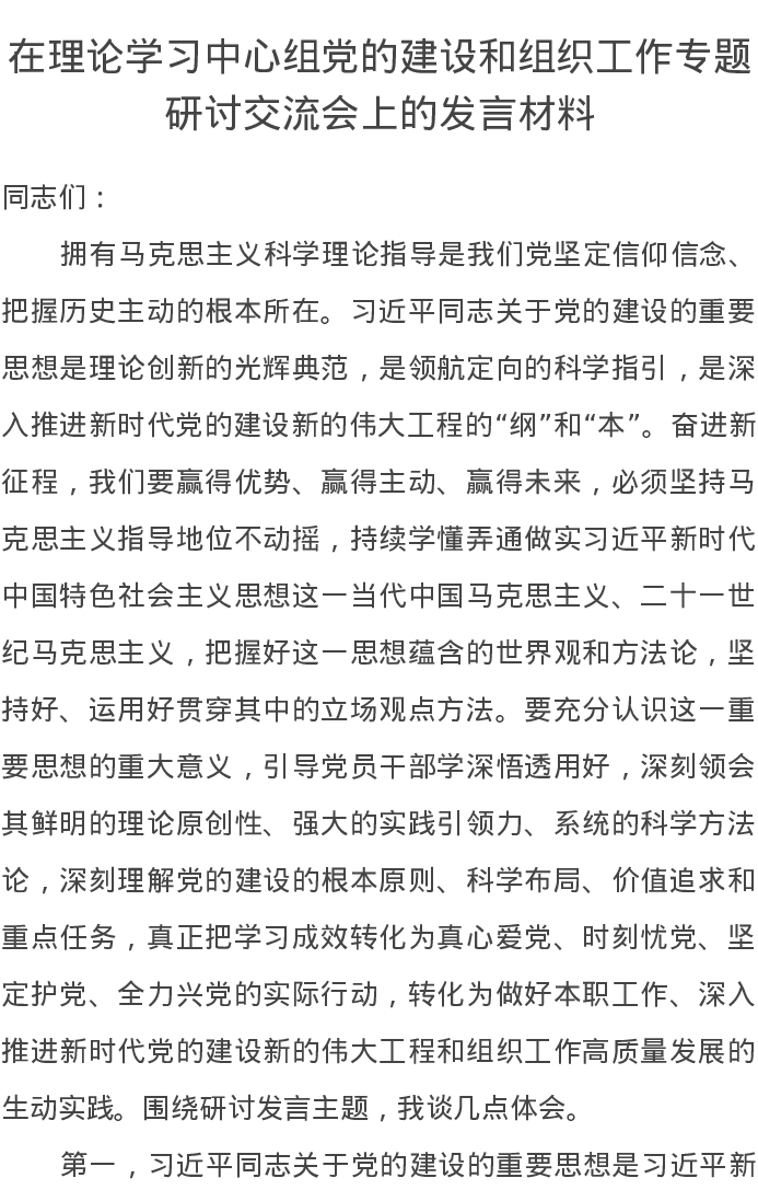 在理论学习中心组党的建设和组织工作专题研讨交流会上的发言材料