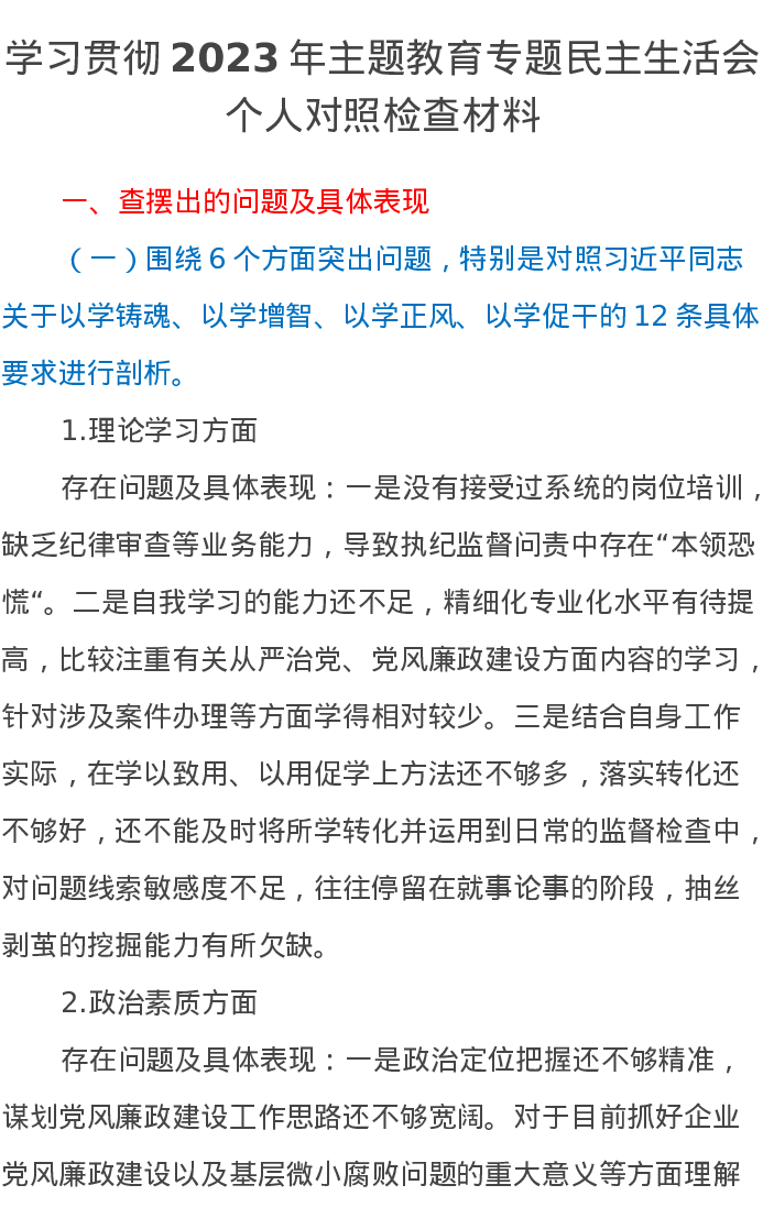 学习贯彻2023年主题教育专题民主生活会个人对照检查材料(特色社会主义思想)