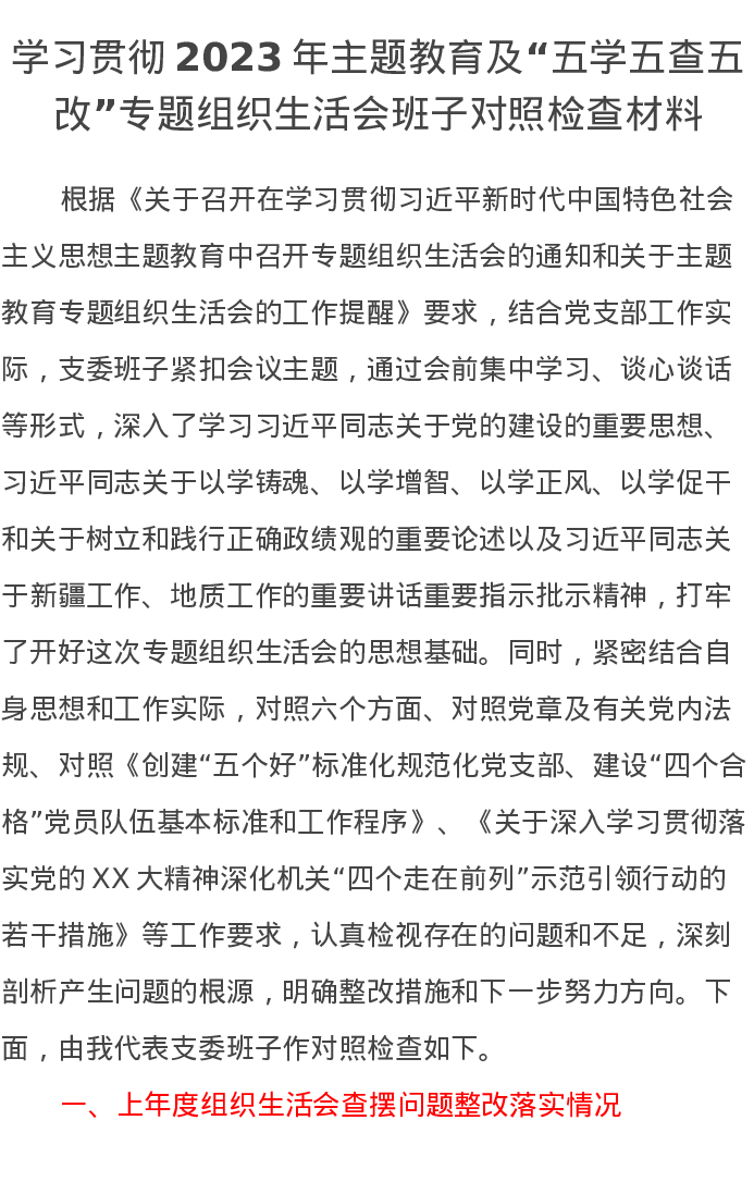 学习贯彻2023年主题教育及“五学五查五改”专题组织生活会班子对照检查材料(特色社会主义思想)