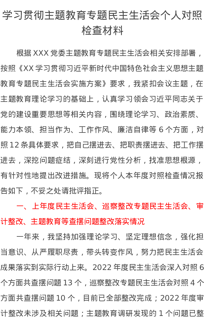 学习贯彻主题教育专题民主生活会个人对照检查材料(特色社会主义思想)