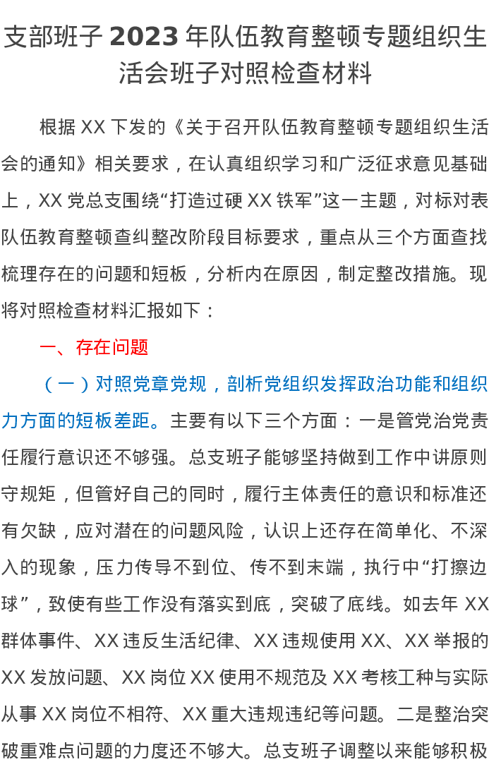 支部班子2023年队伍教育整顿专题组织生活会班子对照检查材料(六个方面特色社会主义思想)