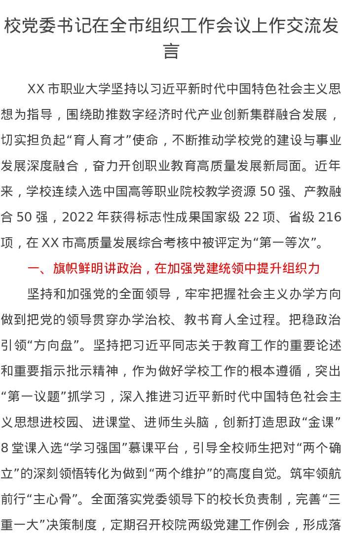 校党委书记在全市组织工作会议上作交流发言