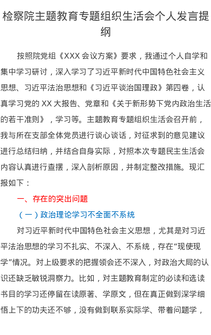 检察院主题教育专题组织生活会个人发言提纲(六个方面特色社会主义思想)