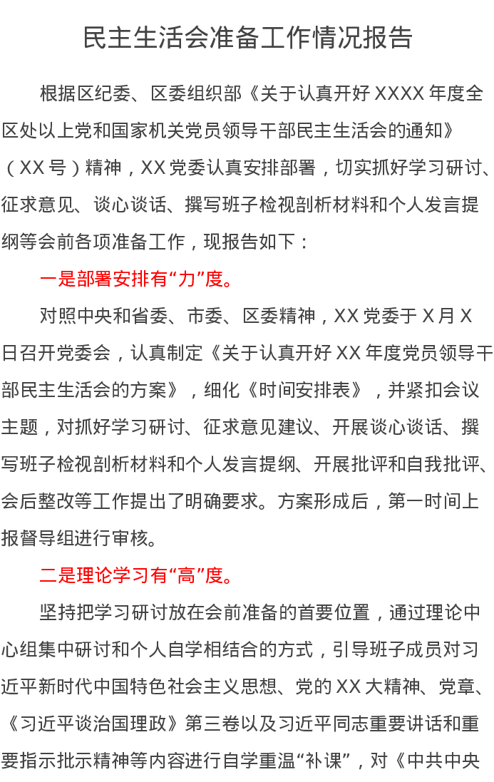 民主生活会准备工作情况报告