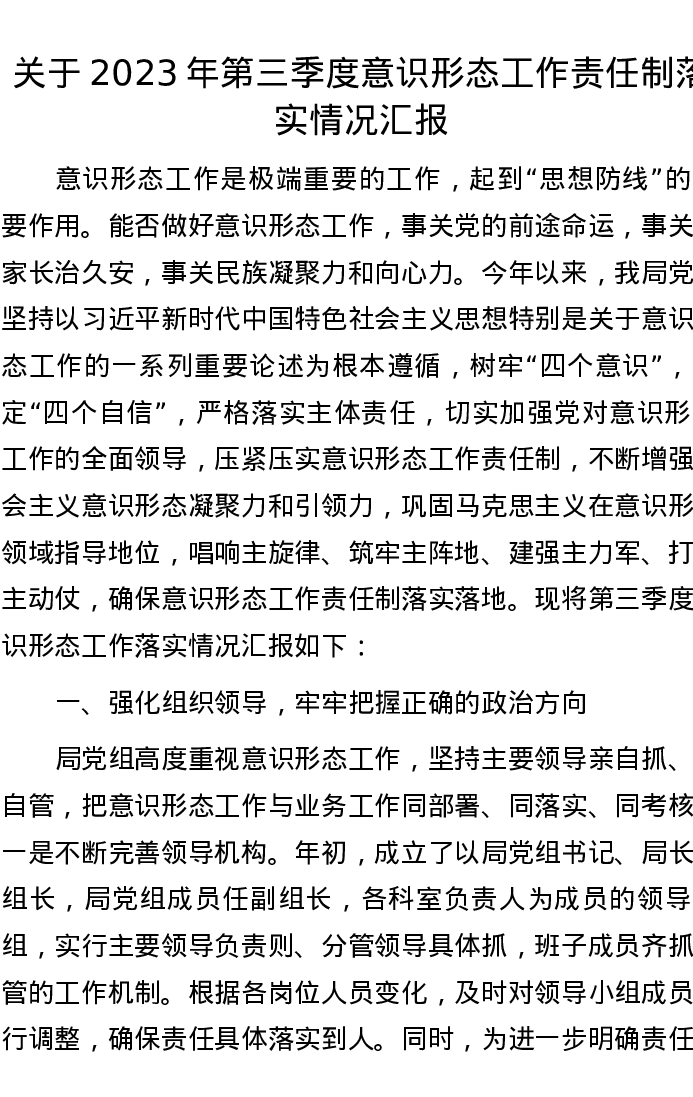 关于2023年第三季度意识形态工作责任制落实情况汇报
