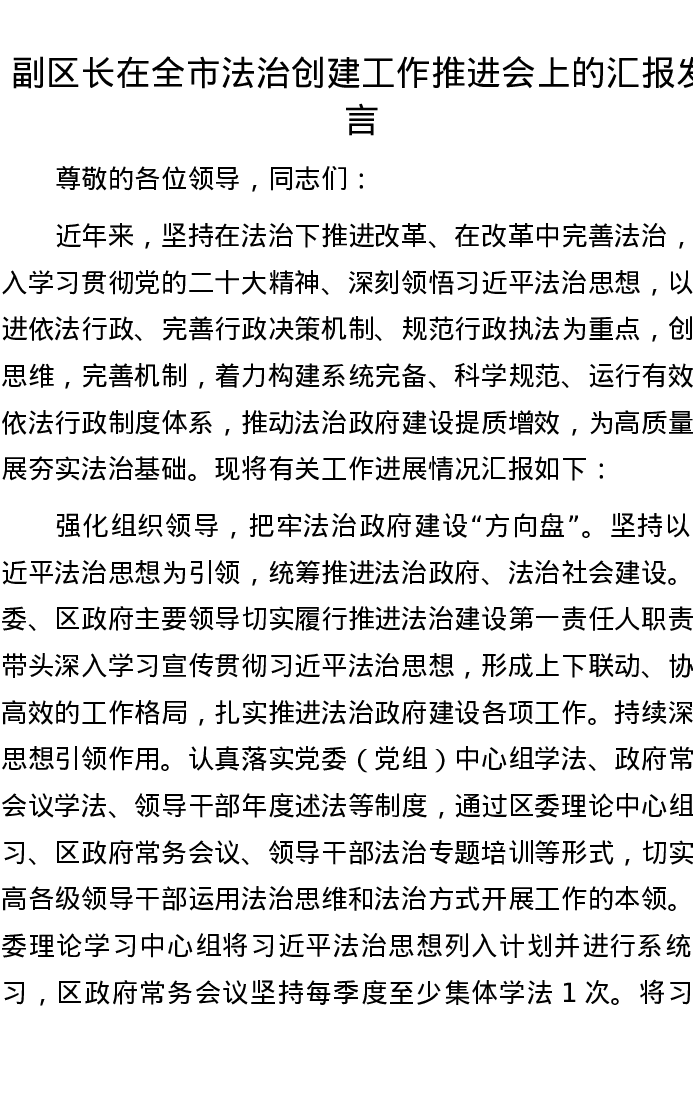 副区长在全市法治创建工作推进会上的汇报发言