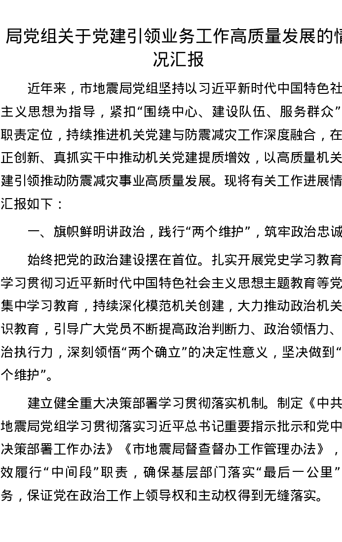 局党组关于党建引领业务工作高质量发展的情况汇报