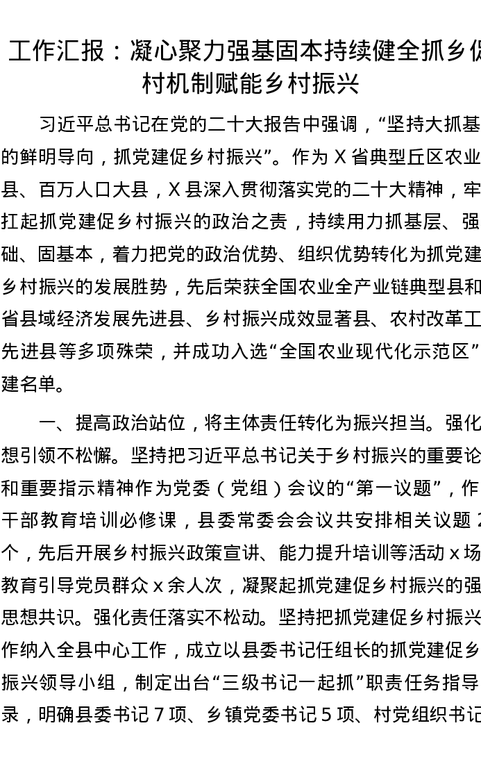工作汇报:凝心聚力 强基固本 持续健全抓乡促村机制赋能乡村振兴