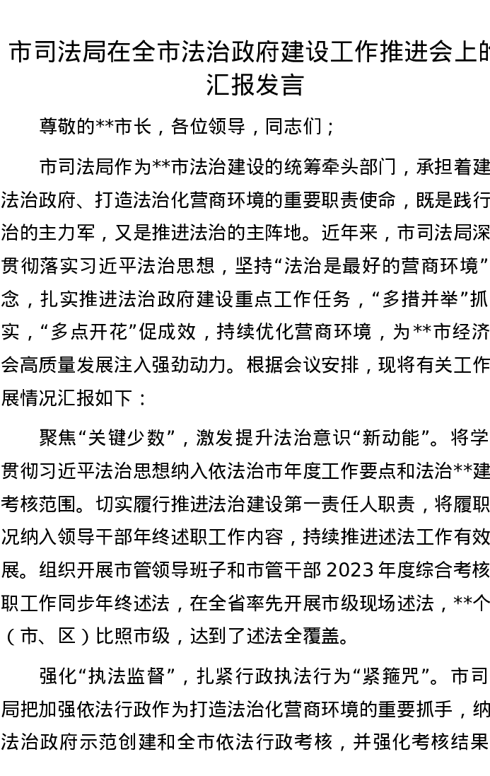 市司法局在全市法治政府建设工作推进会上的汇报发言