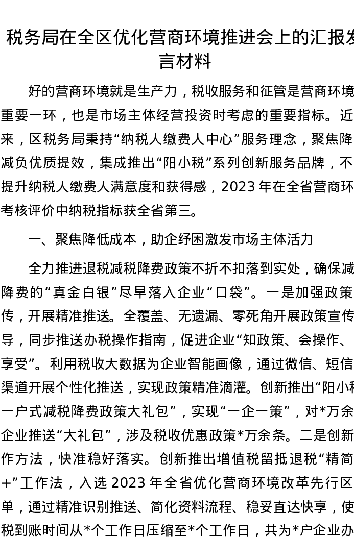 税务局在全区优化营商环境推进会上的汇报发言材料
