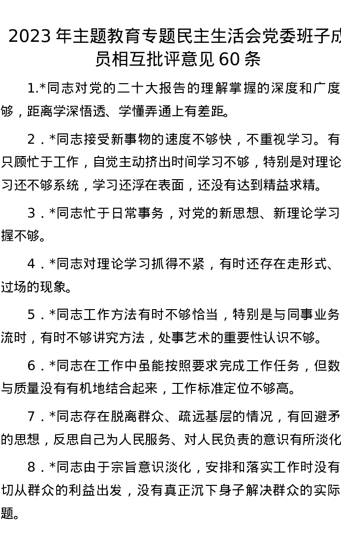 2023年主题教育专题民主生活会党委班子成员相互批评意见60条
