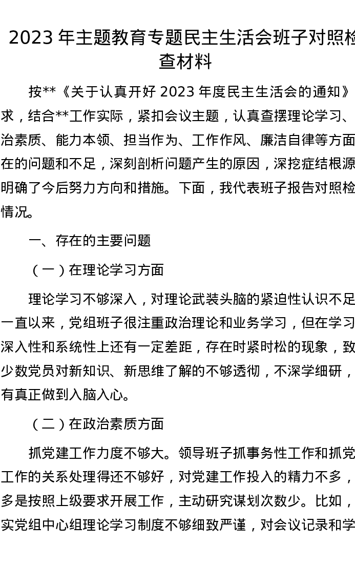 2023年主题教育专题民主生活会班子对照检查材料
