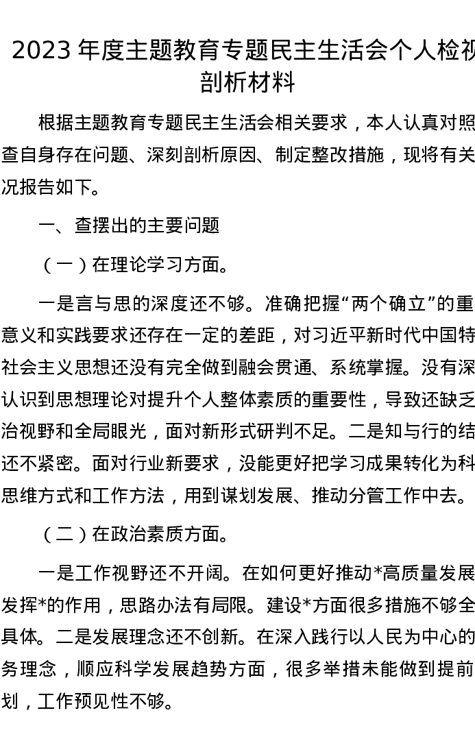 2023年度主题教育专题民主生活会个人检视剖析材料