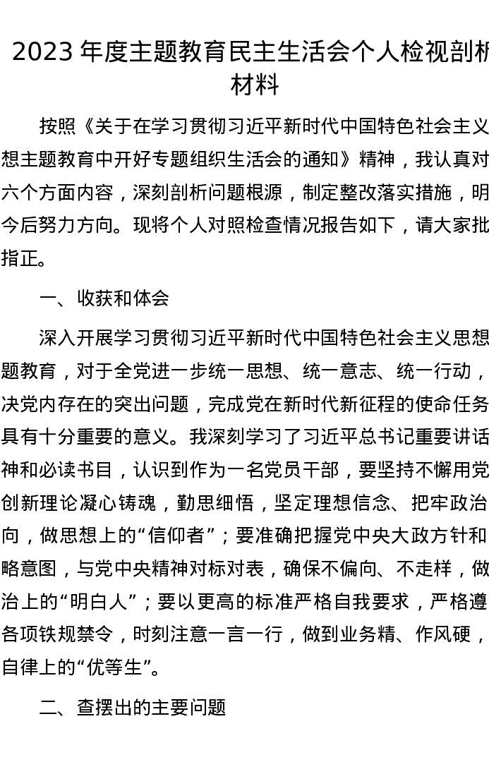 2023年度主题教育民主生活会个人检视剖析材料