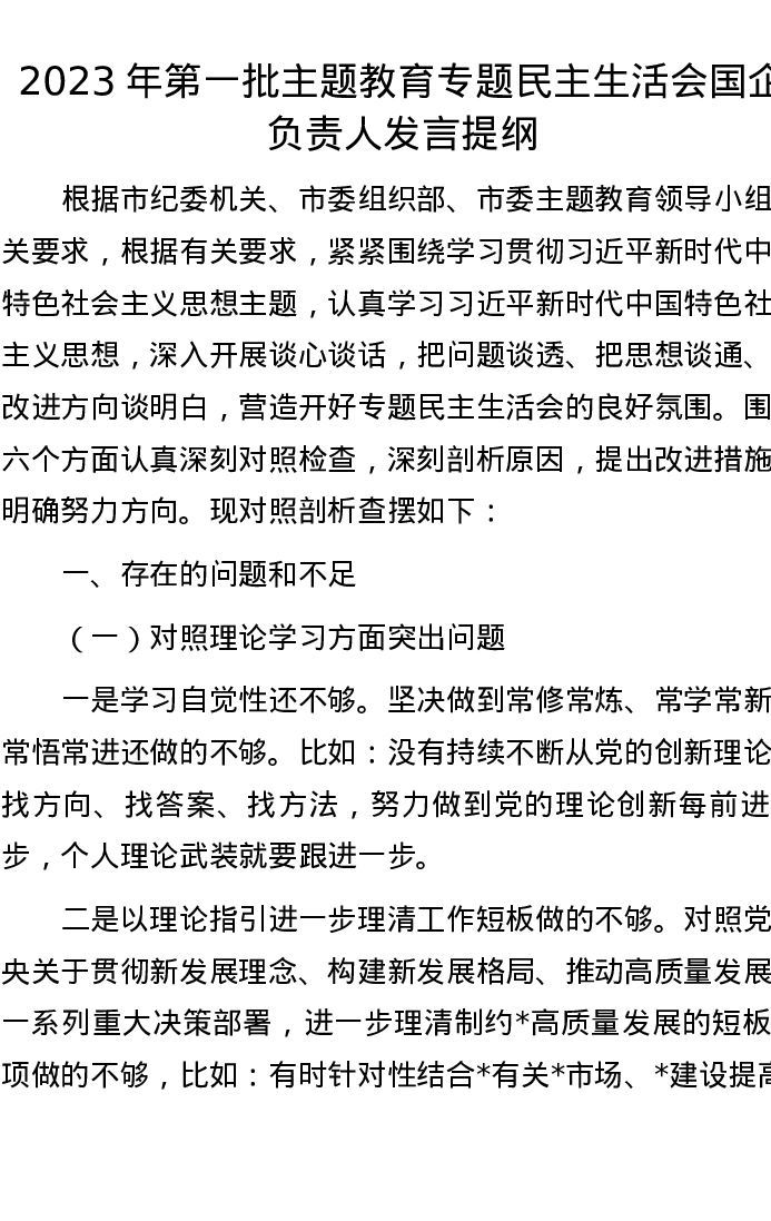 2023年第一批主题教育专题民主生活会国企负责人发言提纲