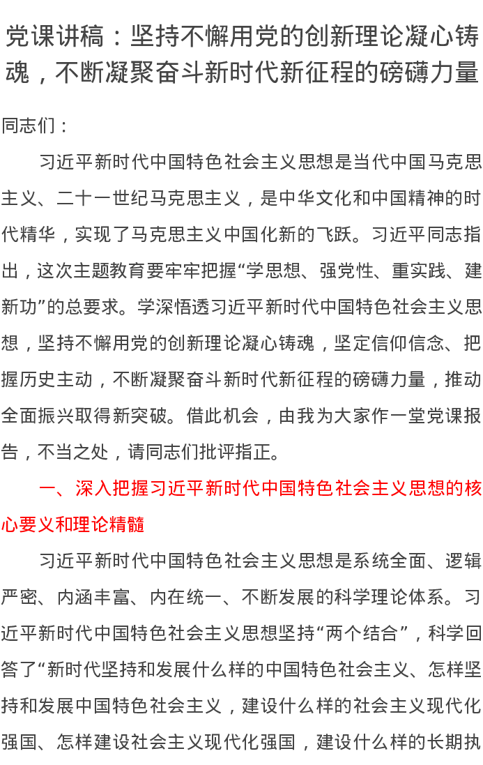 党课讲稿:坚持不懈用党的创新理论凝心铸魂,不断凝聚奋斗新时代新征程的磅礴力量