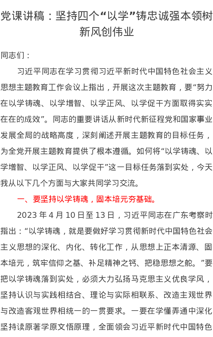 党课讲稿:坚持四个“以学”铸忠诚强本领树新风创伟业