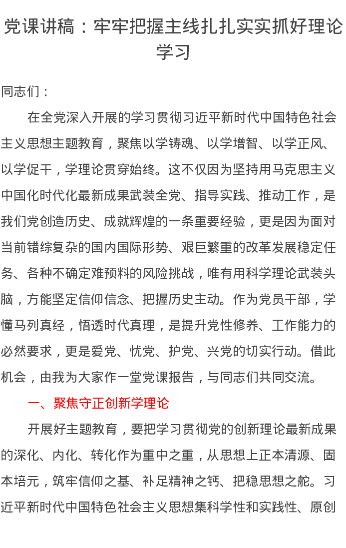 党课讲稿:牢牢把握主线扎扎实实抓好理论学习