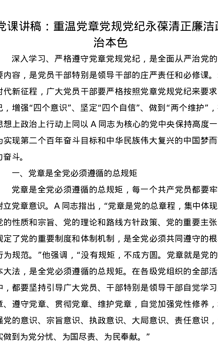 党课讲稿:重温党章党规党纪永葆清正廉洁政治本色